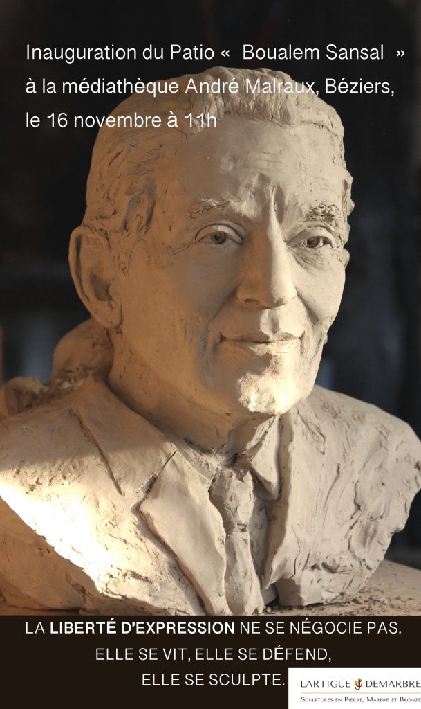En tant qu’artistes, la Poétesse et moi souhaitons participer à la défense de la liberté d’expression si fragile ces derniers temps. Nous allons exposer un buste qui incarne Boualem Sansal, symbole de cette liberté bafouée par le régime algérien. Ce buste représente le courage, la sérénité et l’étincelle de vie dans le regard et le sourire de Boualem Sansal. Il sera exposé à la médiathèque André Malraux à Béziers. Nous sentons l’urgence de parler de lui, de montrer son visage, d’attirer l’attention sur l’injustice de son emprisonnement, de faire réagir nos représentants, et d’éviter le pire, car il est en danger de mort. Nous croyons fermement qu’il doit retrouver la liberté, rentrer en France, et continuer à écrire, activité vitale pour l’humanité.